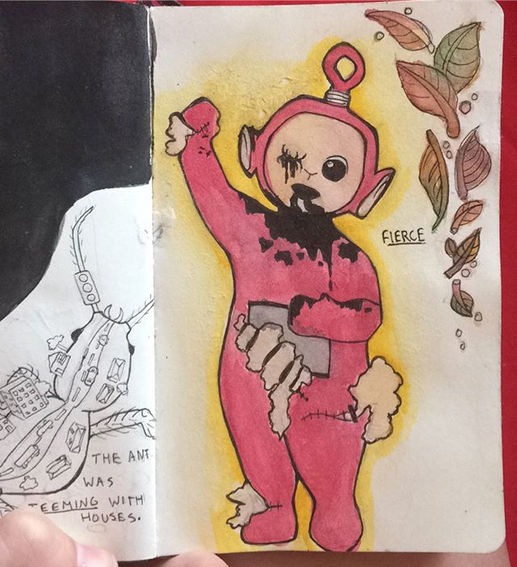 strange inktober gore depiction of a teletubbie. drawn with: ink and watercolour.