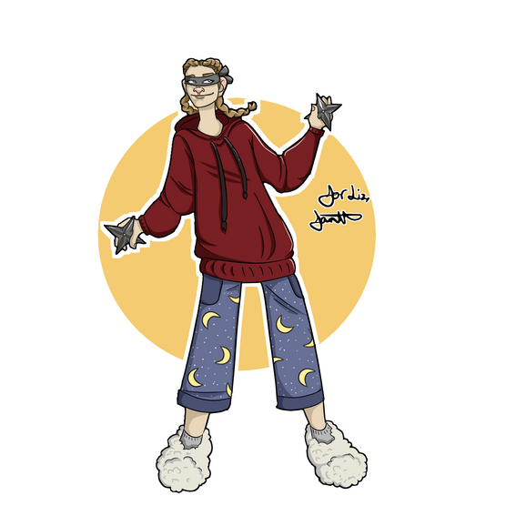A drawing of my friend as a trade, she's dressed as a ninja in pyjamas.